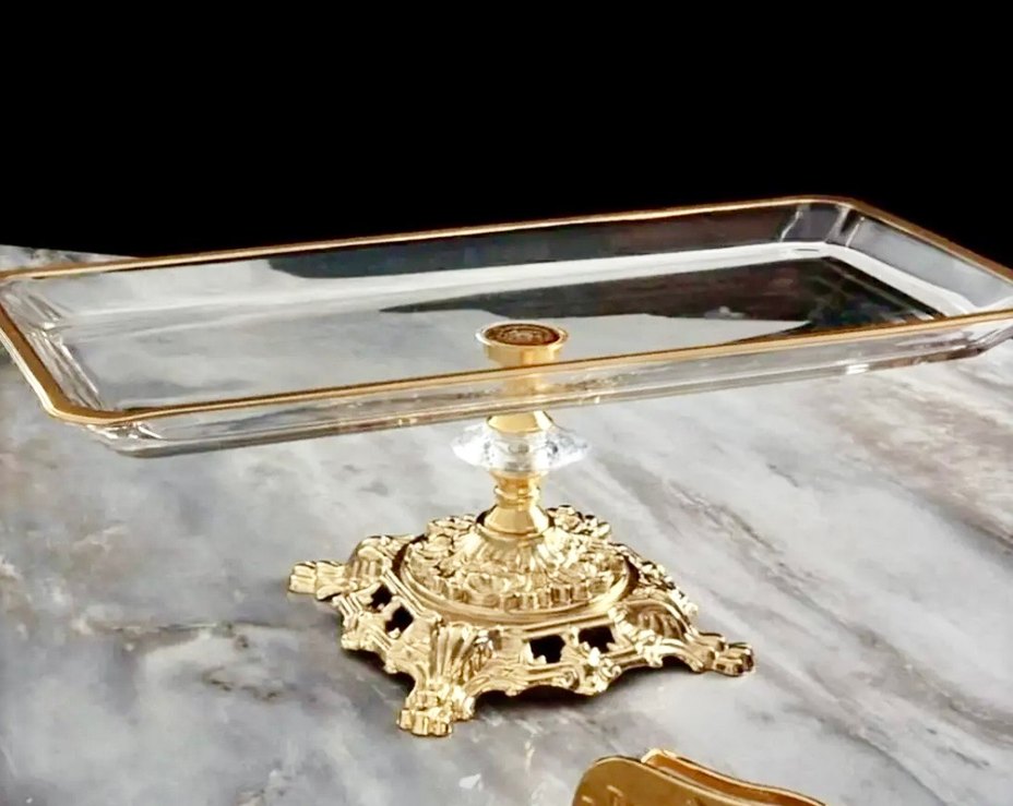 Parlak altın renkte, ayrıntılı desenlere sahip süslü tabanlı ve şeffaf ayrıntılı sunumluk çok iyi durumda