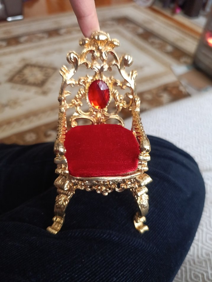 Parlak altın çerçeve ve işlemeli detaylara sahip yüksek sandalye, kırmızı kadife oturma yüzeyi ile lüks bir görünüm sunar.