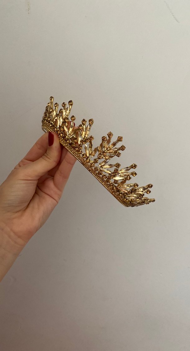 Parlak altın renkli ve taşlı detaylara sahip gelin tacı, klasik ve gösterişli bir tarz sunar.