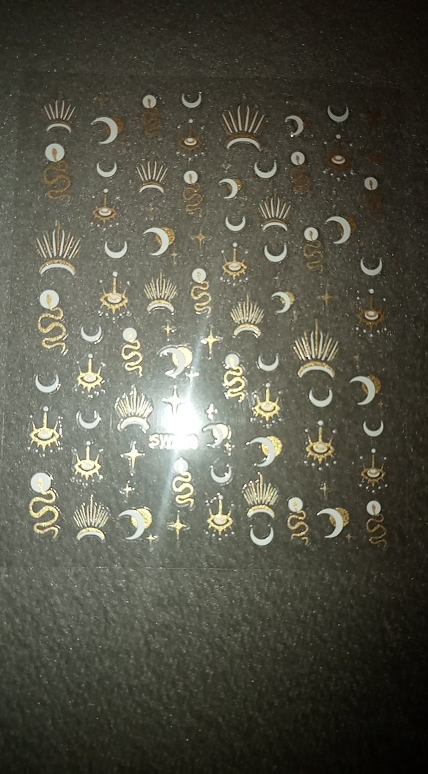 Ay, yıldız, yılan ve taç gibi çeşitli mistik ve göksel figürlerin bulunduğu parlak altın tırnak süslemeleri. ✨