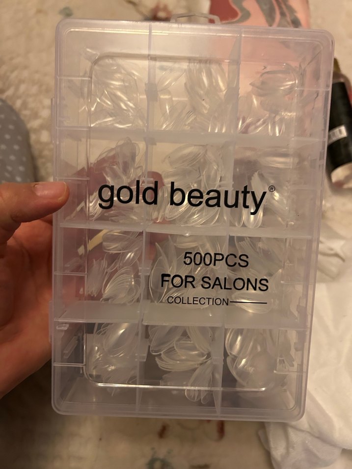 Parlak altın renkli 500 parça tırnak süsü, bölmeli kutuda ve salon kullanımı için uygundur. ✨