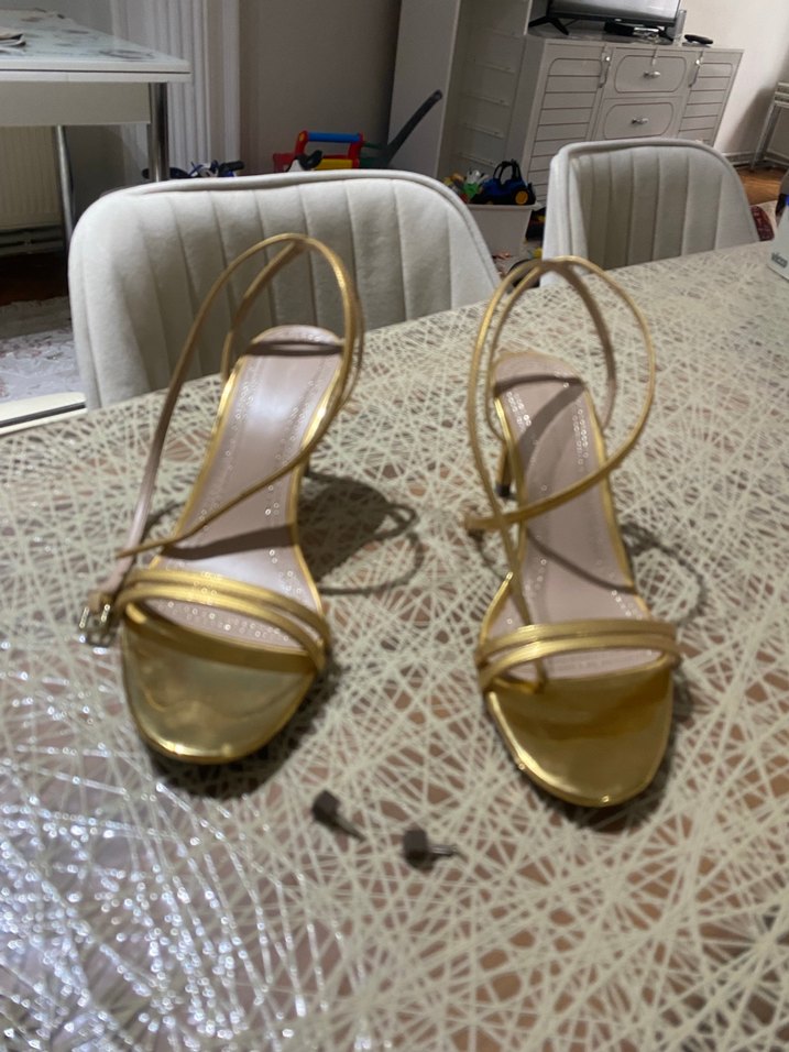 Kadın abiye ayakkabılar, parlak altın renkli, ipeksi dokulu ve tokalıdır. İnce topuklu klasik Paris tarzını yansıtır. ✨