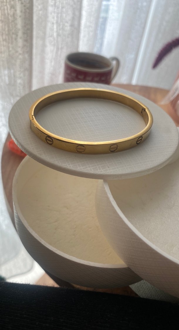 Parlak altın renkte, tokalı ve desensiz kadın bileklik. Klasik zarafetle bohem tarzı birleştirir, romantik akşamlar için uygun.