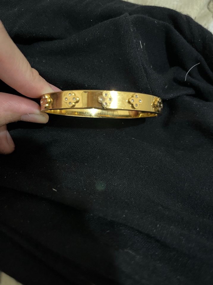 Parlak altın renkte, tokalı ve küçük süslemelerle bohem tarzda kadın bileklik. Düğün için uygun, sade ve desen içermeyen yüzeye sahip.