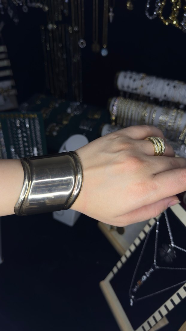Günlük kullanım için uygun, parlak altın renkte tokalı kadın bileklik. Vintage tarzda, desen içermeyen şık ve dikkat çekici tasarım. ✨