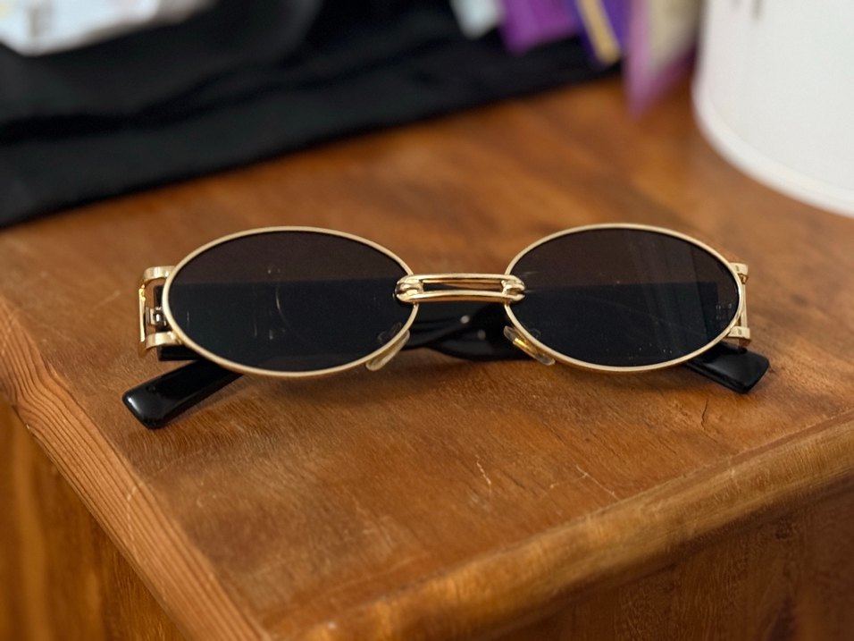Parlak altın renkli tokalı köprüye sahip kadın güneş gözlüğü, klasik retro tarzda bohem ve hippie havası sunar. ✨