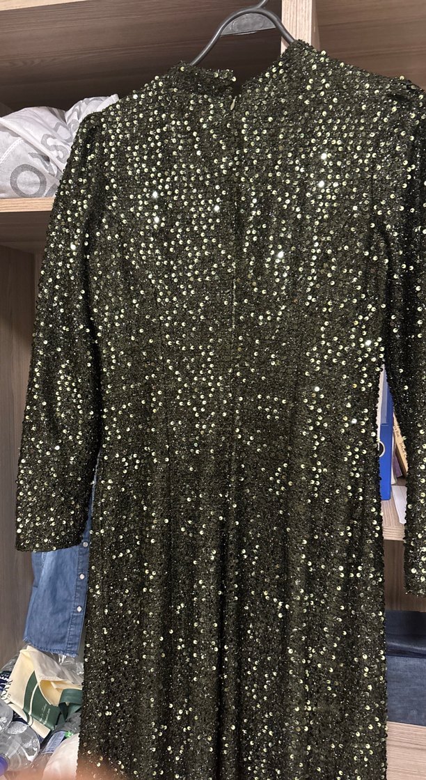 Parlak altın rengi, uzun kollu, yakası kesimli ve vücuda oturan kadın abiye elbise. Parti ve sokak modasına uygun, ışıltılı kumaşla tasarlanmıştır. ✨