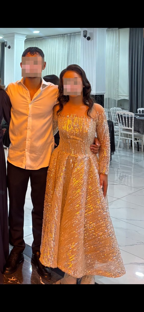 Özel dikim.Parlak altın rengi, uzun kollu ve straplez kesimli bu dar kesim nişan elbisesi, modern klasik ve göz alıcı bir tarz sunar. ✨