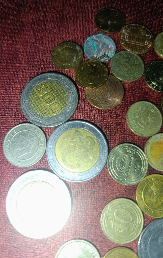 Kırmızı zemin üzerinde parlak altın ve gümüş renkli çeşitli bozuk paralar yer alıyor.