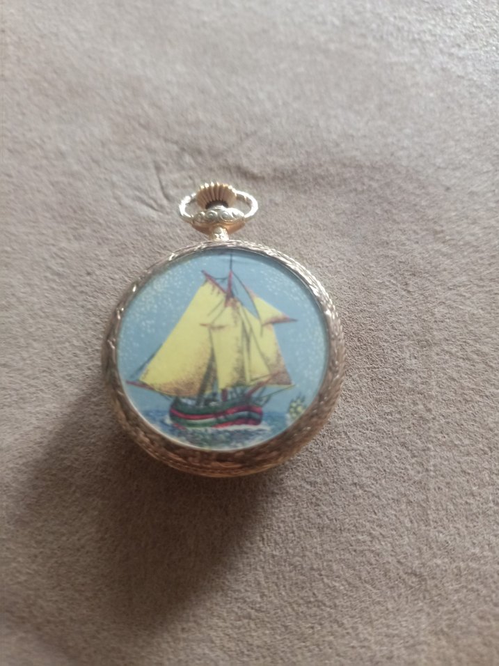 Parlak altın renkli vintage cep saatinin kapağında detaylı bir gemi resmi bulunur, bohem tarzını yansıtır. ⌚