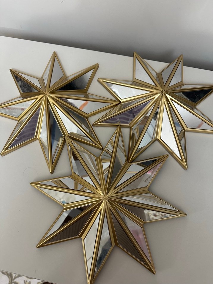 Parlak altın renkte, geometrik tasarımlı yıldız şeklinde dekoratif aynalar. İç mekanlara şıklık katar. ✨