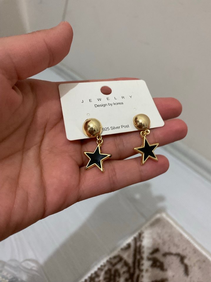 Parlak altın mini küpeler, cesur siyah yıldız desenli, romantik buluşmalar için Paris sokak stili dokunuşlu.
