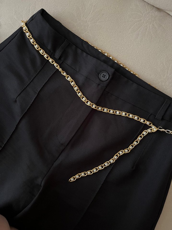 Parlak altın renkli, zincir detaylı kadın bel zinciri, günlük kullanıma uygun şık ve sade bir aksesuardır. ✨