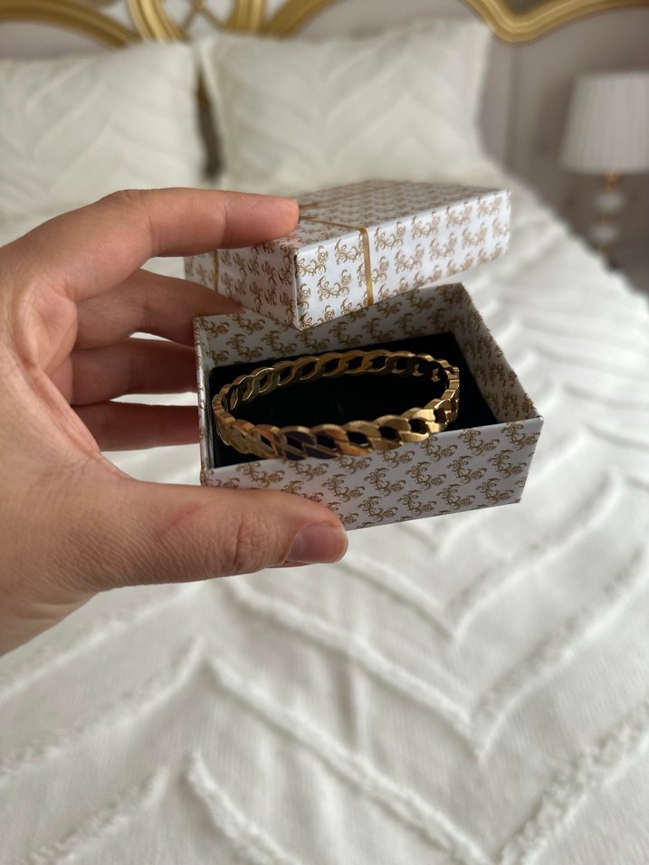 Parlak altın renkte, zincir detaylı ve yılan desenli bileklik, sade ve bohem tarzı romantik akşamlar için uygun. Çelik