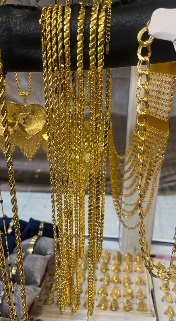 Parlak altın renkli, zincir detaylı ve desenli kadın vücut zinciri, gösterişli partiler için ideal. Moda öncülerine uygun avant-garde tarzda.