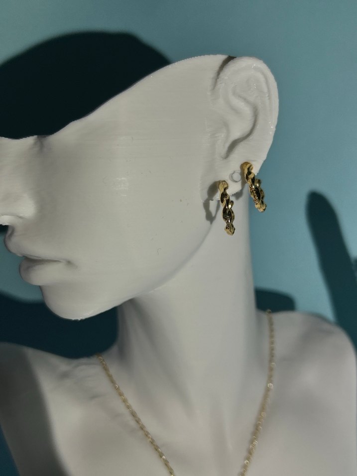 Parlak altın renkli, zincir detaylı ve yılan desenli kısa boy küpeler, minimalist ve şık bir sokak stili için uygundur.