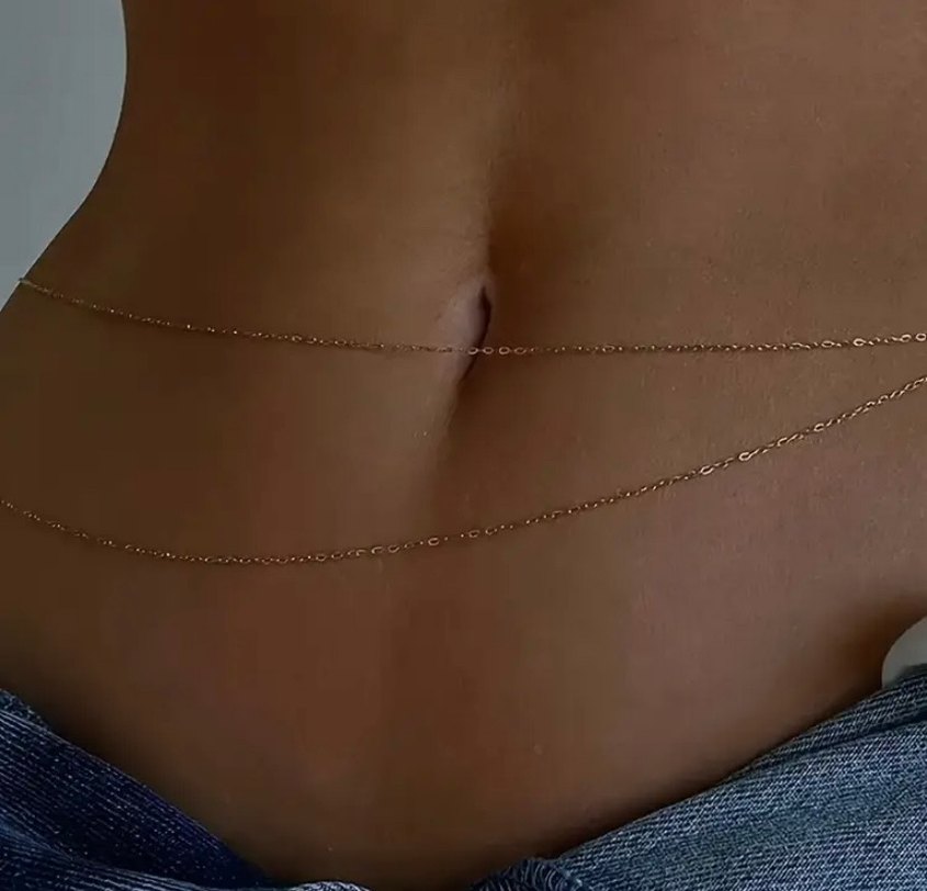 Parlak altın renginde, zincir detaylı, minimalist bohem tarzda günlük kullanıma uygun vücut zinciridir. ✨