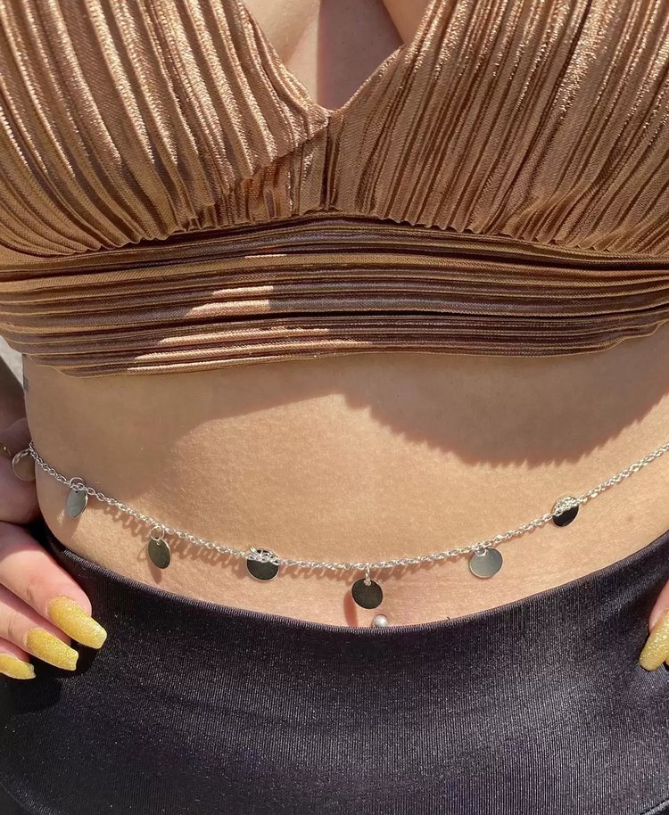 Parlak altın renkte, zincir detaylı ve dairesel süslemelere sahip vücut zinciri. Bohem tarzda, günlük şıklık için uygun. ✨gümüş renk ❤️