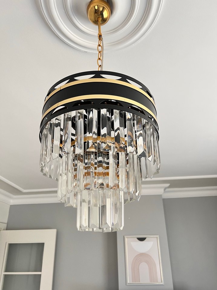 Parlak altın zincir ve çerçeveye sahip, katmanlı kristal prizmalardan oluşan şık bir avize. Tavana dekoratif altın montajla asılır.