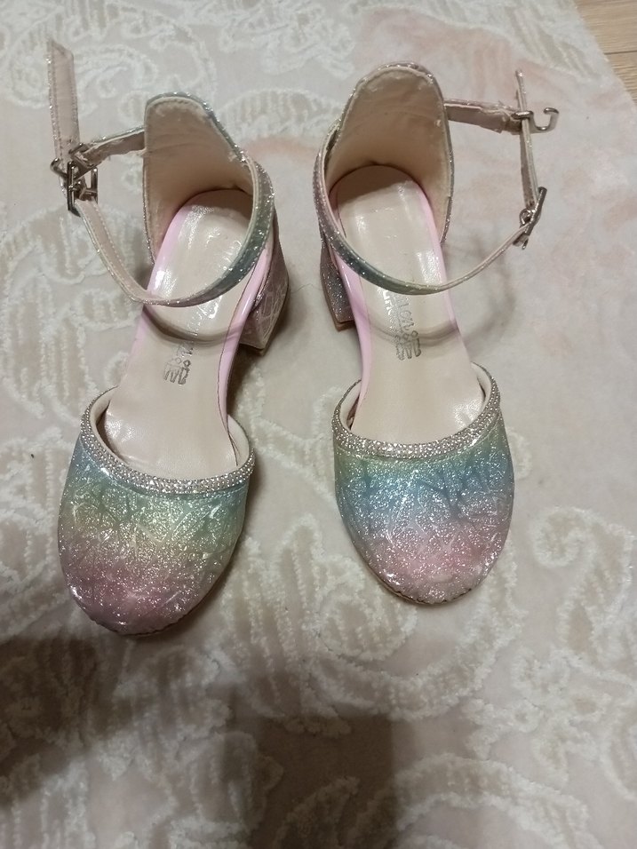 Kızlar için bağcıklı bilek kayışlı, pastel tonlarda parıltılı batik desenli babet ayakkabı