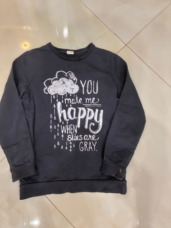 Gri renkli, uzun kollu ve yuvarlak yakalı kız sweatshirtü. Parlak baskılı 'You make me happy when skies are gray' yazısı ve yumuşak, sıcak tutan kumaşı vardır. ️