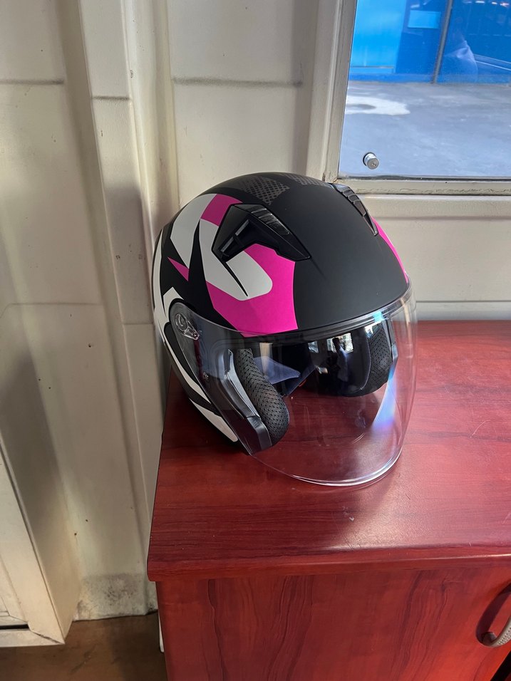 Parlak yüzeyli, koyu pembe baskılı biker motosiklet kaskı. Dayanıklı plastikten üretilmiş, şeffaf vizörlü, sokak stili ve rock punk havası taşıyor. ️