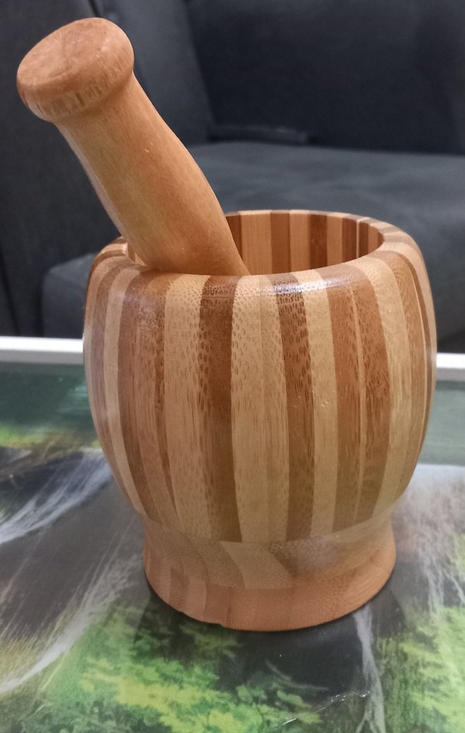 Parlak yüzeye sahip bej tonlarında ahşap havan ve tokmak, baharatları veya otları öğütmek için uygundur. Dayanıklı ve kullanışlıdır.