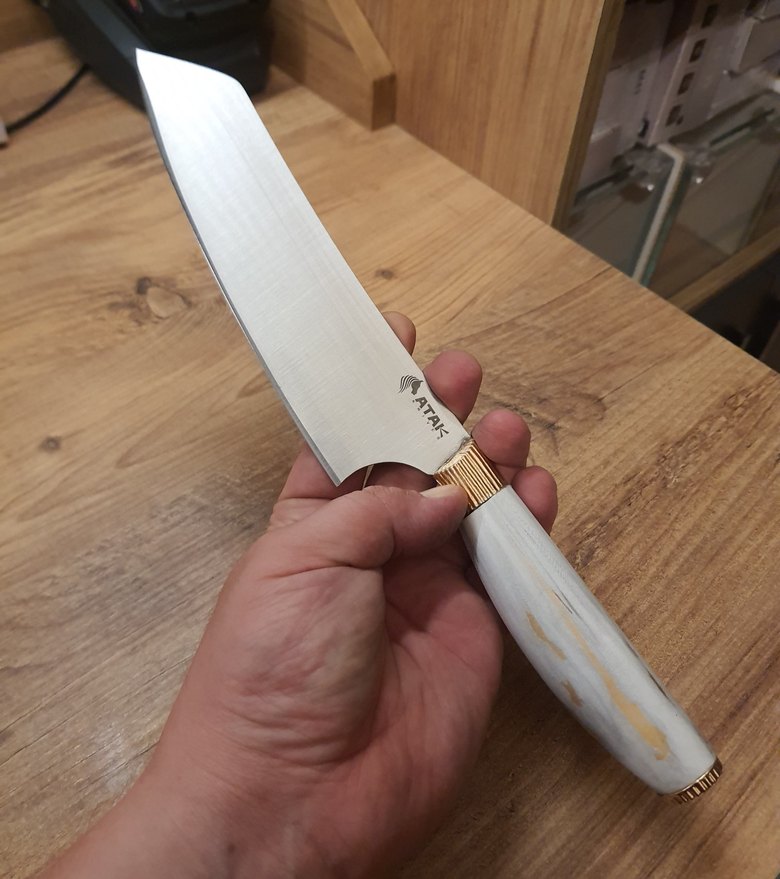 Profesyonel mutfak deneyimi arayan şef ve aşçıların vazgeçilmezi Atak Şef Bıçağı satışta. PPC enjeksiyon üstü soft su transfer kaplaması ile özel tasarımı, üstün performans sağlayan 2,5mm çelik mat yüzeyi ve el işçiliği ile iki kez bilenmiş parlak ağız tekniği sayesinde kusursuz keskinlik sunuyor. Paslanmaz çelik malzemesi ile uzun ömürlü dayanıklılık, geniş gövdesi ile yüksek basınç uygulayarak kolay kesim imkanı tanıyan bu profesyonel bıçak, sebze doğramadan et kesimine kadar her türlü mutfak işleminde mükemmel sonuçlar veriyor. Atak Knives'ın kaliteli el işçiliği ve son teknoloji birleşiminin ürünü olan bu şef bıçağı, hem profesyonel mutfaklarda hem de evde yemek yapmayı seven kullanıcılar için ideal seçim.