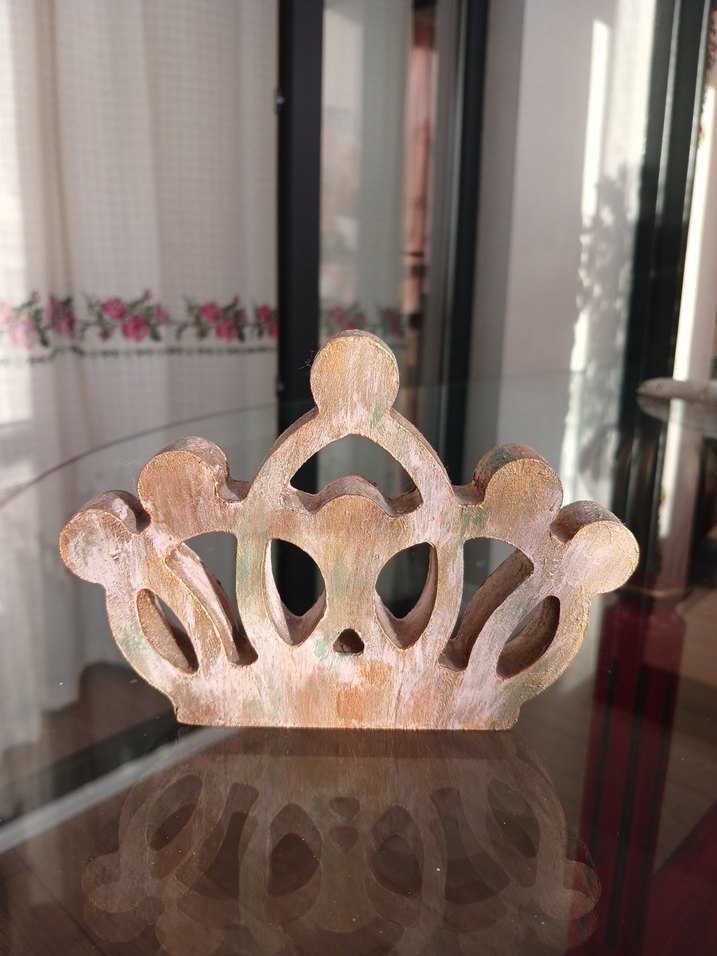 Parlak bej renkte, taç şeklinde ahşap dekoratif figür, doğal bir dokunuş sağlar. Düzgün yüzeyi ahşabın dokusunu ön plana çıkarır. Marka temsili, tamamen el boyamasıdır.