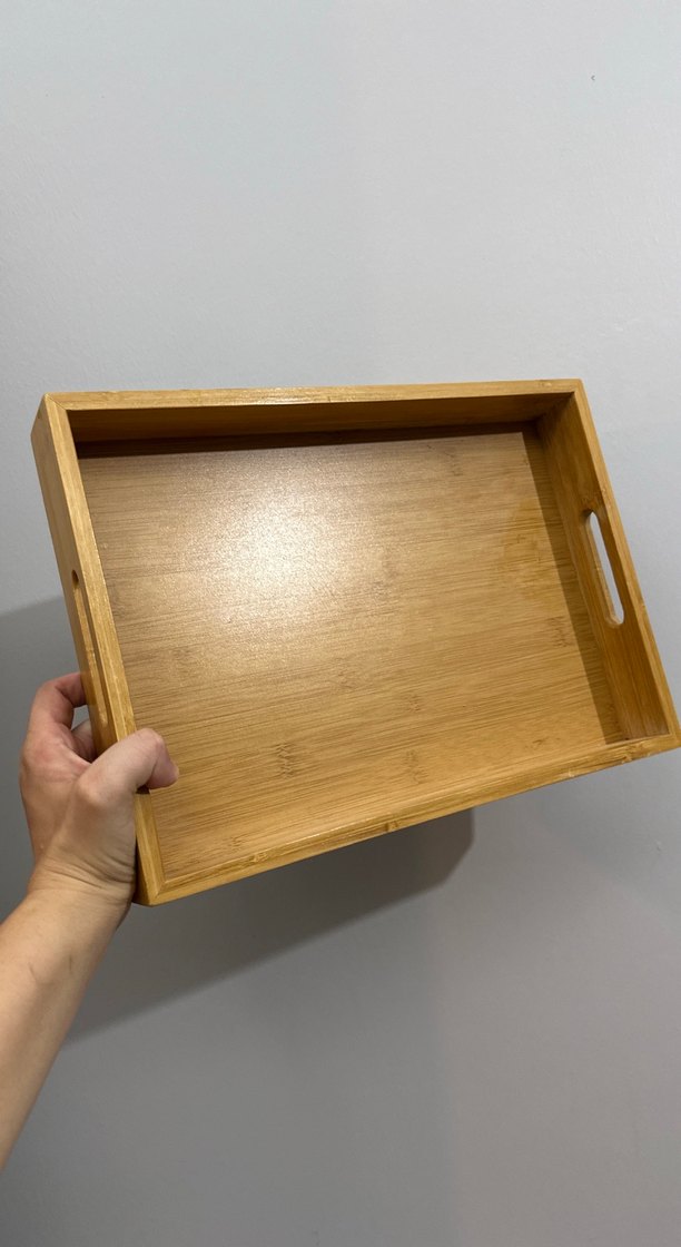 Yan tarafında kulplar bulunan parlak bej renkte ahşap tepsi marka ikea değildir