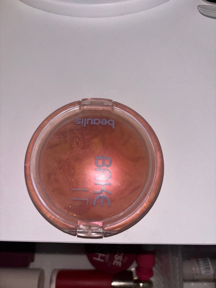 "BAKE" yazılı kapaklı kompakt ambalajda parlak bej allık. Yanaklara doğal bir parlaklık katar.