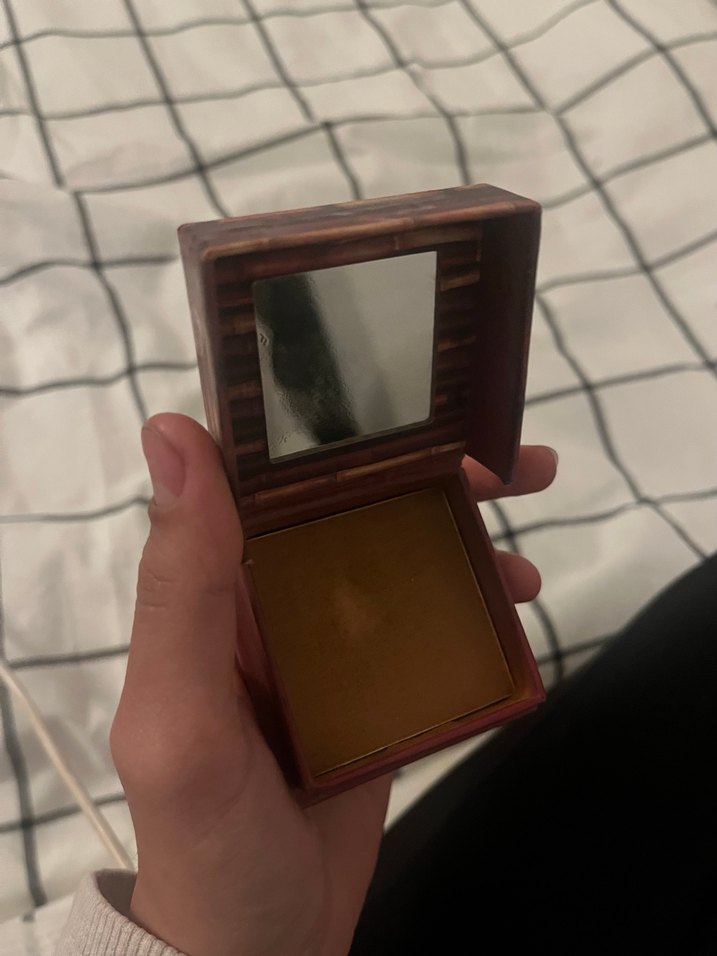 Parlak bej renkli allık, içinde ayna bulunan kompakt kutuda, pratik kullanım için uygundur.