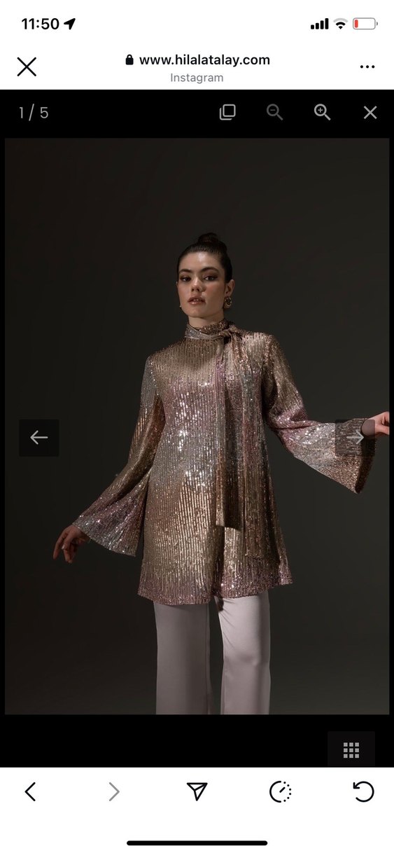 Parlak bej renk, yüksek yakalı ve bağlamalı uzun kollu tunik. İpek gibi kumaştan, bol kesim ve batik desenli, parti için uygun. ✨