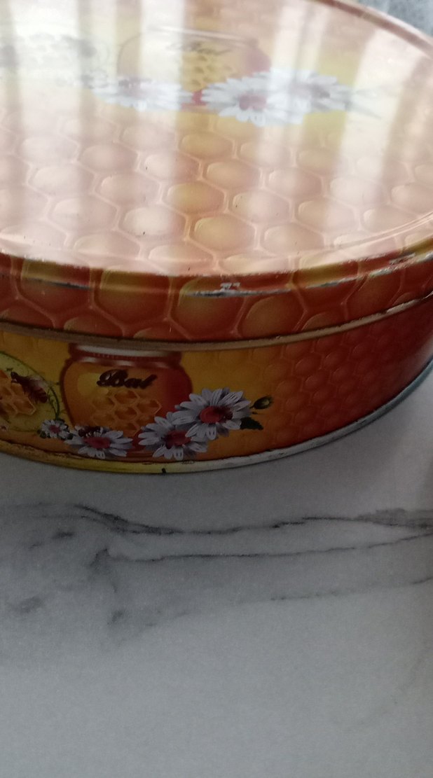 Parlak bej renkte, petek desenli ve çiçekli bal kavanozu figürlü metal saklama kutusudur.