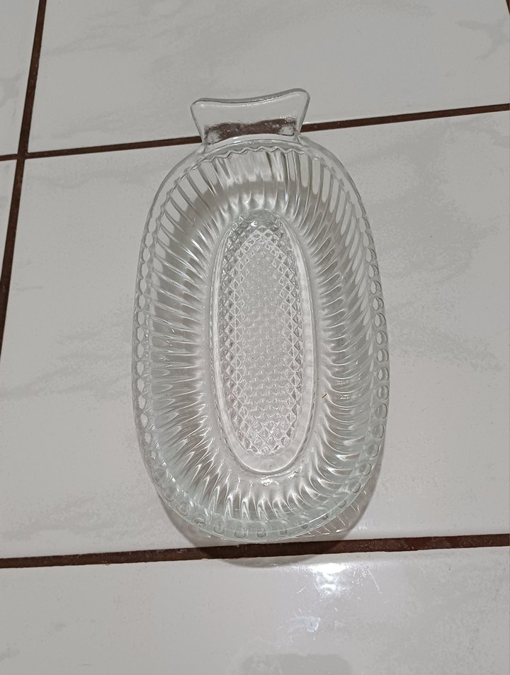 Cocuklar için Parlak bej renkte, dokulu oval desenli ve tutma sapı bulunan cam Rende kalıbı.