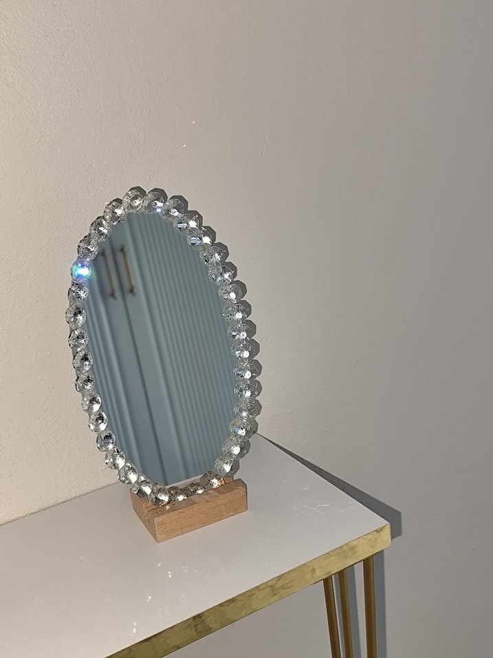 Parlak çerçeveli ve ahşap tabanlı bej masa aynası, her odaya şıklık katıyor.