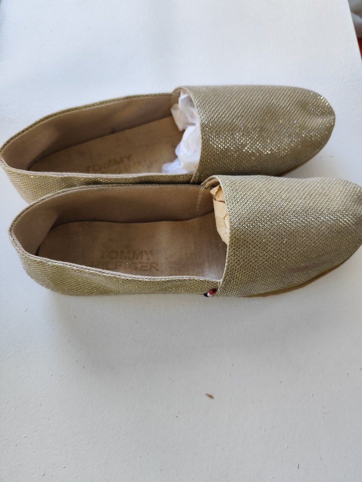 Bej renkli, parlak görünümlü erkek espadril ayakkabılar. Kauçuk tabanlı, minimalist ve günlük kullanıma uygun.hic kullanılmamış
