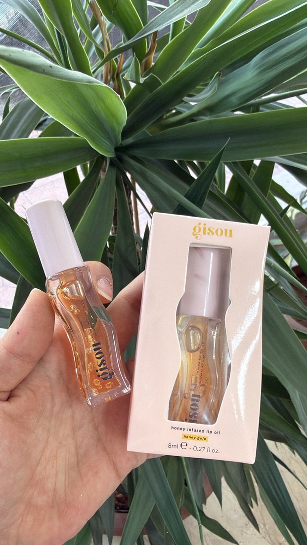 Gisou markalı, bal ile zenginleştirilmiş formüle sahip parlak bej dudak parlatıcısı. Üzerinde 'bisou' yazısı bulunur.