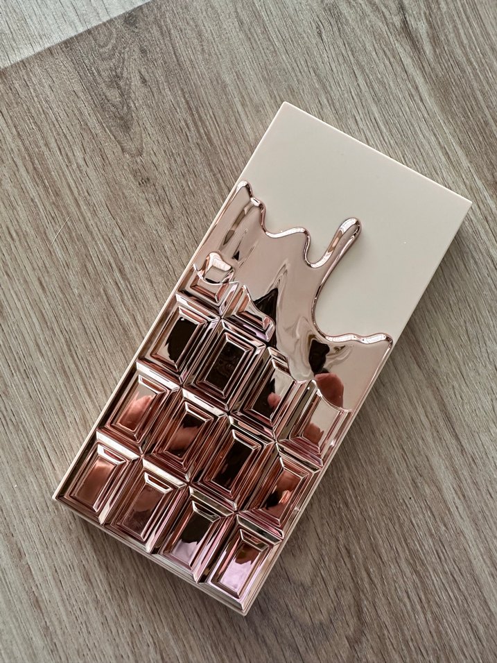 Parlak bej tonlarında, çikolata barı şeklinde tasarlanmış metalik kaplamalı göz farı paleti. ✨