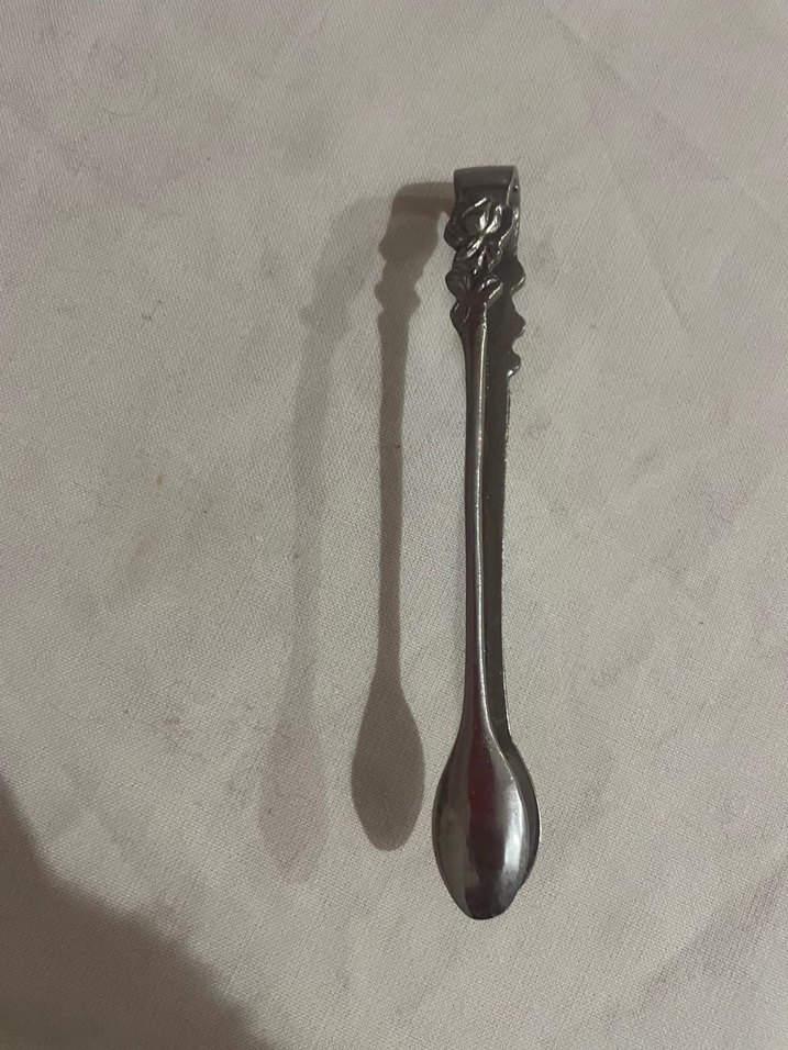 Parlak bej renkte, sapında kıvrımlı detay bulunan dekoratif gümüş şekerlik