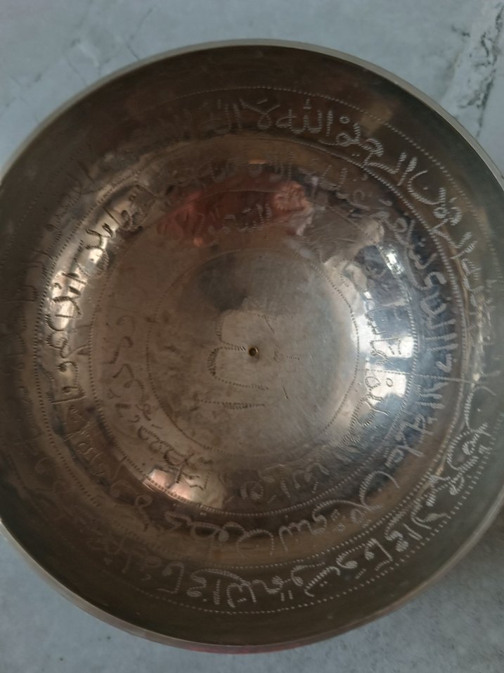 Parlak bej renkte, etrafı Arapça yazılarla işlenmiş geleneksel tabak. Düz yüzeyi işçiliği ön plana çıkarır. ️