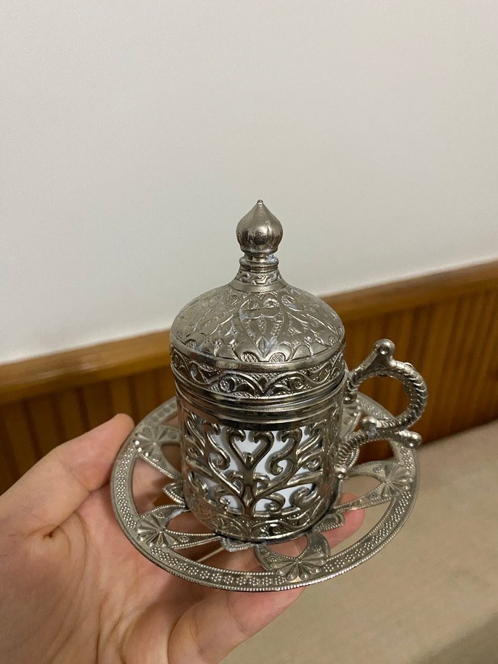Parlak bej renkte, detaylı işlemeli metal kahve fincanı ve uyumlu tabağı. ☕