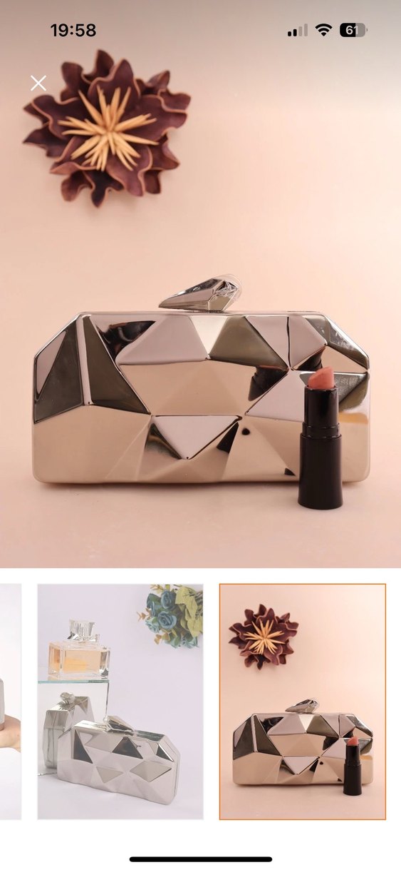 Kadınlar için parlak bej metal yüzeye sahip, geometrik desenli çağdaş ve ışıltılı portföy çanta. Günlük kullanıma uygun, modaya öncülük eden şık bir aksesuar.