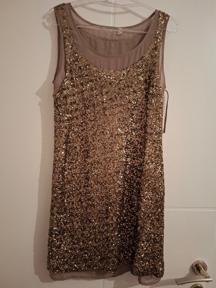 Kolsuz, vücuda oturan kesimde, drapeli bej midi elbise. Yuvarlak yakalı ve parlak, desensiz kumaştan, parti için uygun. ✨