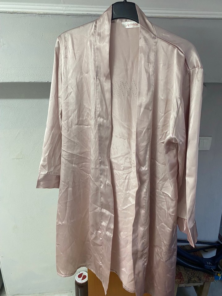 Parlak bej renkte, midi boy, uzun kollu, bol kesim kadın sabahlık. Paris sokak modasına uygun sade tasarım. ✨