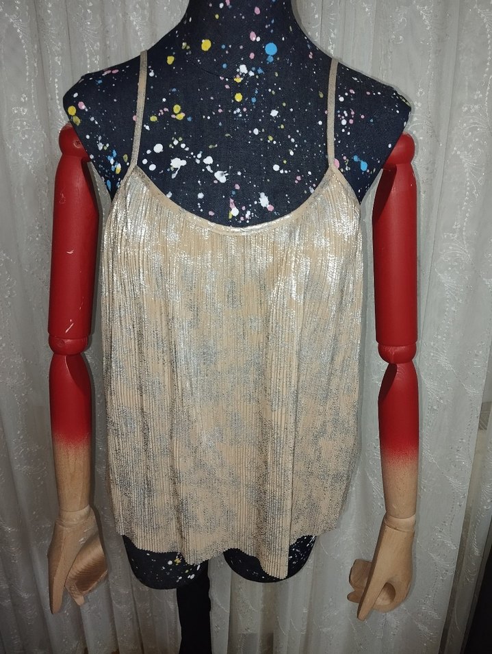 Parlak bej pilili kumaştan, salaş kesim, askısız mini bluz. Hafif tie-dye deseniyle bohem tarzı yansıtır.. ✨