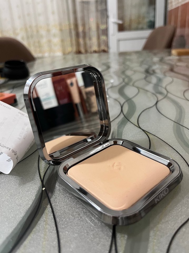 KIKO markalı, kompakt kutuda parlak bej renkli preslenmiş pudra, cilde pürüzsüz bir görünüm sağlar. bi iki defa kullandim cok tatlı şık tedavi gordgm icin kullanmiyorm yeni aldim