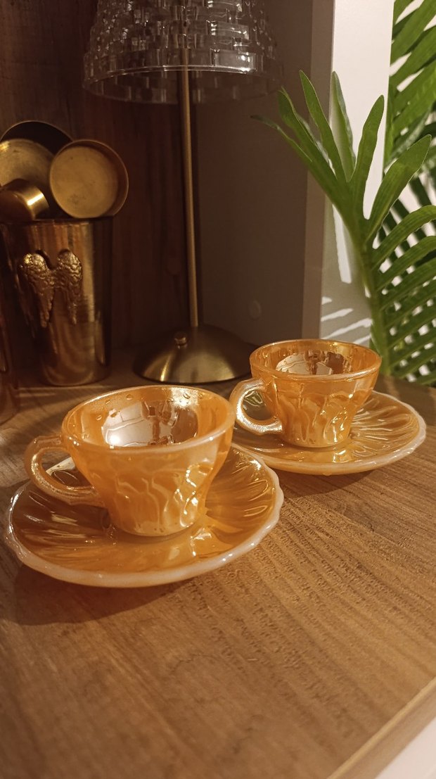 Parlak bej renkte, kabartmalı desene sahip iki seramik fincan ve tabak seti. Sıcak içecek sunumu için uygundur. ☕ dörtlüdür
