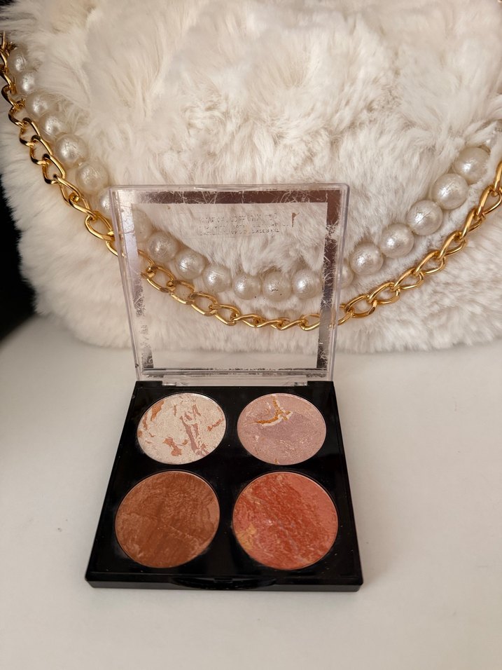 Dörtlü göz farı paleti, parlak bej ve sıcak tonlarda, açık ve koyu renklerle çeşitli makyaj seçenekleri sunar. ✨