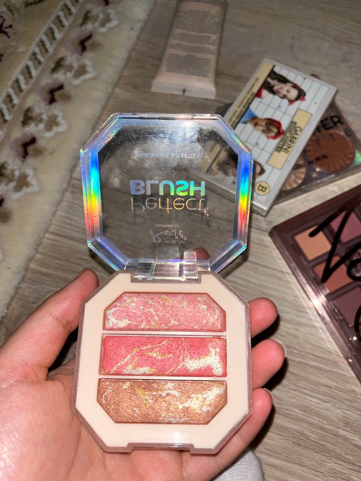 Işıltılı bitişli, açık bej tonlarında üçlü allık seti, yanaklara doğal bir parlaklık katmak için uygundur.